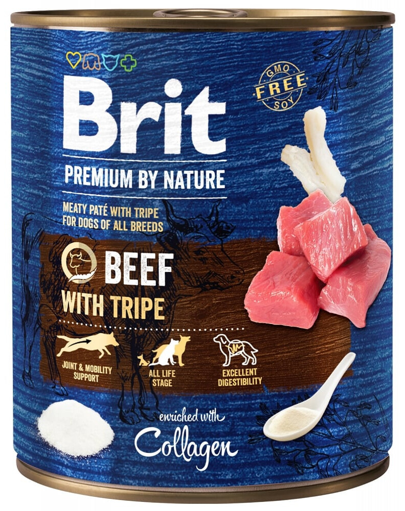 Zloženie: hovädzie mäso 36 %, hovädzí vývar 35,5 %, kuracie mäso 22 %, vnútornosti 4 %, kolagén 1 %, minerálne látky 1 %, lososový olej 0,5