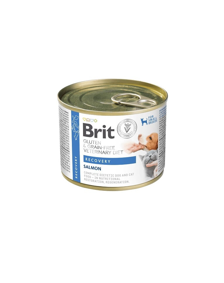 Brit Veterinary Diet Dog/Cat Recovery je špecializované diétne krmivo, vyvinuté pre zvieratá v období rekonvalescencie. Jeho receptúra spája ľahkú stráviteľnosť s vysokou nutričnou hodnotou, čo umožňuje účinne podporovať regeneráciu po prekonanom ochorení, chirurgickom zákroku alebo iných záťažiach organizmu. Losos a kuracia pečeň sú zdrojom ľahko vstrebateľných bielkovín a nevyhnutných živín, ktoré podporujú obnovu svalovej hmoty a navracajú sily. Ďalšiu podporu poskytujú prebiotiká a beta-glukány, ktoré podporujú mikroflóru čriev a imunitu. Krmivo neobsahuje lepok, takže je bezpečné aj pre zvieratá s citlivým tráviacim systémom.