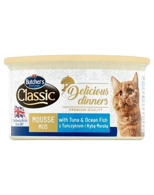BUTCHER'S Classic Delicious Dinners tuniak 85g je najlepšie, bezlepkové mokré krmivo, ktoré bolo obohatené o taurín, vitamín A a D. Vďaka týmto zložkám Krmivo sa stáva nielen chutným , ale aj zdravým pre srdce nášho maznáčika, podporuje jeho prirodzenú imunitu, zrak, kosti a kĺby. Každá porcia Butcher's mokrého krmiva je pripravovaná v lahodnej mäsovej pene, ktorej vôňa povzbudí chuť do jedla aj tej najjemnejšej mačky. BUTCHER'S je špičkový rad krmív pre mačky. Spĺňa požiadavky všetkých štvornožcov všetkých veľkostí bez ohľadu na ich vek. Vďaka taurínu a kvalitnému mäsu je najlepším zdrojom živín pre našich štvornohých členov domácnosti.