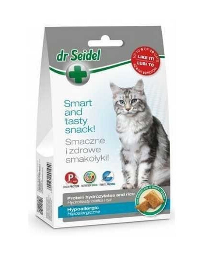 Jedinečná svačinka pro kočky Dr. Seidel s individuálně přizpůsobeným složením pro citlivé zažívání nebo potravinové alergie. Hlavními složkami pamlsku jsou bílkovinné hydrolyzáty a rýže, které snižují riziko potravinové intolerance.Zdravý doplněk denní stravy.