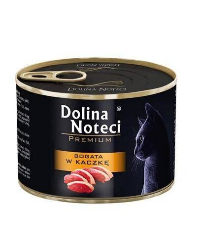 Dolina Noteci pre mačky bohaté na kačice je kompletné vlhké krmivo pre dospelé mačky všetkých plemien. Hodnotné kačacie mäso poskytuje cenné živiny a primeraný obsah bielkovín. Kačica je tiež zdrojom mastných kyselín, železa na prevenciu chudokrvnosti, selénu na ochranu pred oxidatívnym stresom a zinku na podporu zdravého stavu pokožky. Krmivo z Doliny Noteci obsahuje vlhké, šťavnaté kúsky mäsa, pripomínajúce tak domáci pokrm, ktorý svojou vysokou chutnosťou a intenzívnou arómou určite zaujme aj tú najvyberavejšiu mačku. Krmivo poskytuje súbor vitamínov a minerálov potrebných pre mačacie organizmus, podporujúce imunitu a zdravie mačky, ďalej taurín - esenciálnu aminokyselinu podporujúci organizmus. Receptúra bez obilnín znižuje riziko alergických reakcií, vďaka čomu môžu krmivo jesť aj alergici na mačky. Zloženie: hovädzie mäso 25% (pľúca, pečeň, srdce), vývar , kačica 15 % (žalúdok, mäso 5 %, pečeň, koža), kuracie 15 % (pečeň, srdce, žalúdky), bravčové mäso 10 % (žalúdok), minerálne látky.Recenzie