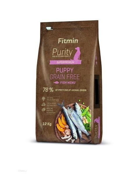 Pokrm obsahuje brambory a zelený hrášek, které slouží jako náplň jídla. Neobsahuje žádné lepkové přísady, které mohou zpomalovat průchod střevem a přispívat k zácpě nebo jiným zažívacím potížím. Vláknina z červené řepy, pivovarské kvasnice a lněné semínko rovněž zajišťují správné trávení a mikroflóru. Za studena lisovaný olej z norského lososa zajistí, že srst vašeho psa bude v perfektní kondici po mnoho let. Jako celek je Fitmin Dog Purity Grain Free Puppy Fish vynikající, nejlepší krmivo pro štěňata. Zajistí vyvážený vývoj.Složení: .