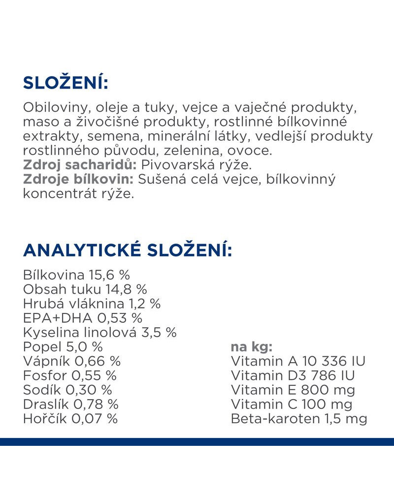 SLOŽENÍ: bílkoviny 15,6 %, tuky 14,8 %, hrubá vláknina 1,2 %, EPA+DHA 0,53 %, kyselina linolová 3,5 %, hrubé popeloviny 5,0 %, vápník 0,66 %, fosfor 0,55 %, sodík 0,30 %, draslík 0,78 %, hořčík 0,07 %; na kg: vitamin A 10 336 IU, vitamin D3 786 IU, vitamin E 800 mg, vitamin C 100 mg, beta-karoten 1,5 mg.