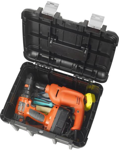 Box s bezpečným uzamykacím systémem zajišťujícím pevné kovové západky, které zajišťují obsah při přepravě. Má širokou rukojeť s vroubkovanou ruční částí pro snadné přenášení.