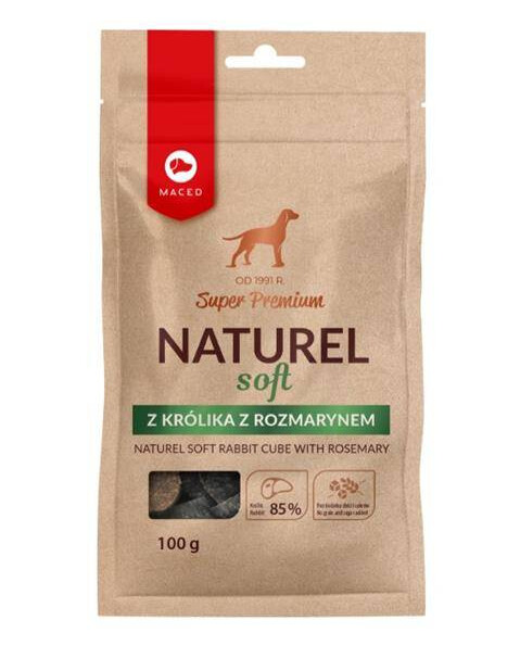 Maced Super Premium NATUREL MÄKKÝ S ROZMARÍNOM je zdravou pochúťkou pre psov. Jemné kúsky obohatené o rozmarín posilňujú srsť psa a zvyšujú chutnosť produktu jeho arómu.< /br > Obsah až 85% králika je bohatosťou chuti, ktorej neodolá ani ten najvyberavejší pes.