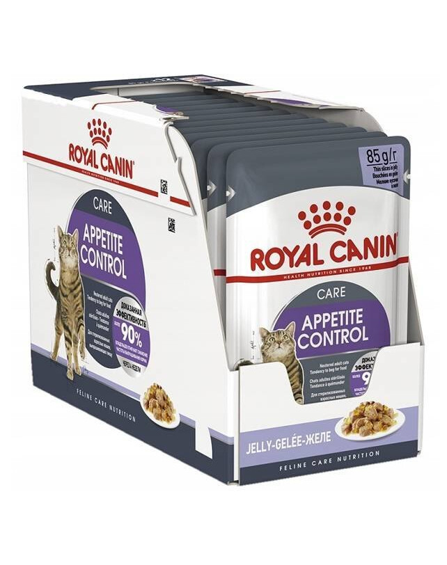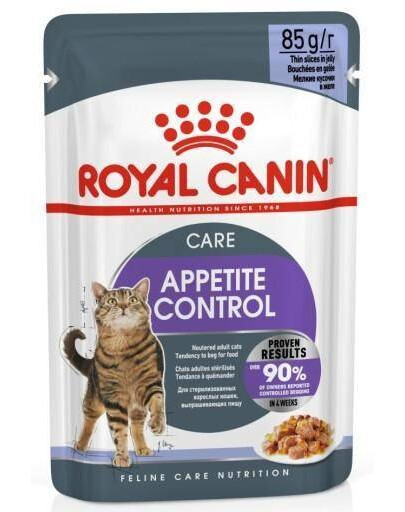 ROYAL CANIN Appetite Control jelly 85g (sáčok) Appetite Control želé krmivo pre mačky pomáha znižovať pocit hladu vďaka špeciálnej receptúre, ktorá podporuje sýtosť u mačiek, ktoré majú tendenciu trvať na jedle medzi jedlami. Zníženie rizika vzniku nadváhy vďaka miernemu množstvu tuku a obmedzenému kalorickému príjmu pomáha mačke udržať si zdravý tvar tela. Prídavok L-karnitínu podporuje metabolizmus tukov. Krmivo Royal Canin Appetite Control je kompletné jedlo, ktoré obsahuje mäso a živočíšne produkty, ryby a rybie produkty, obilniny, produkty rastlinného pôvodu, rastlinné bielkovinové extrakty a minerálne soli. Hmotnosť vrecka je 85 g.