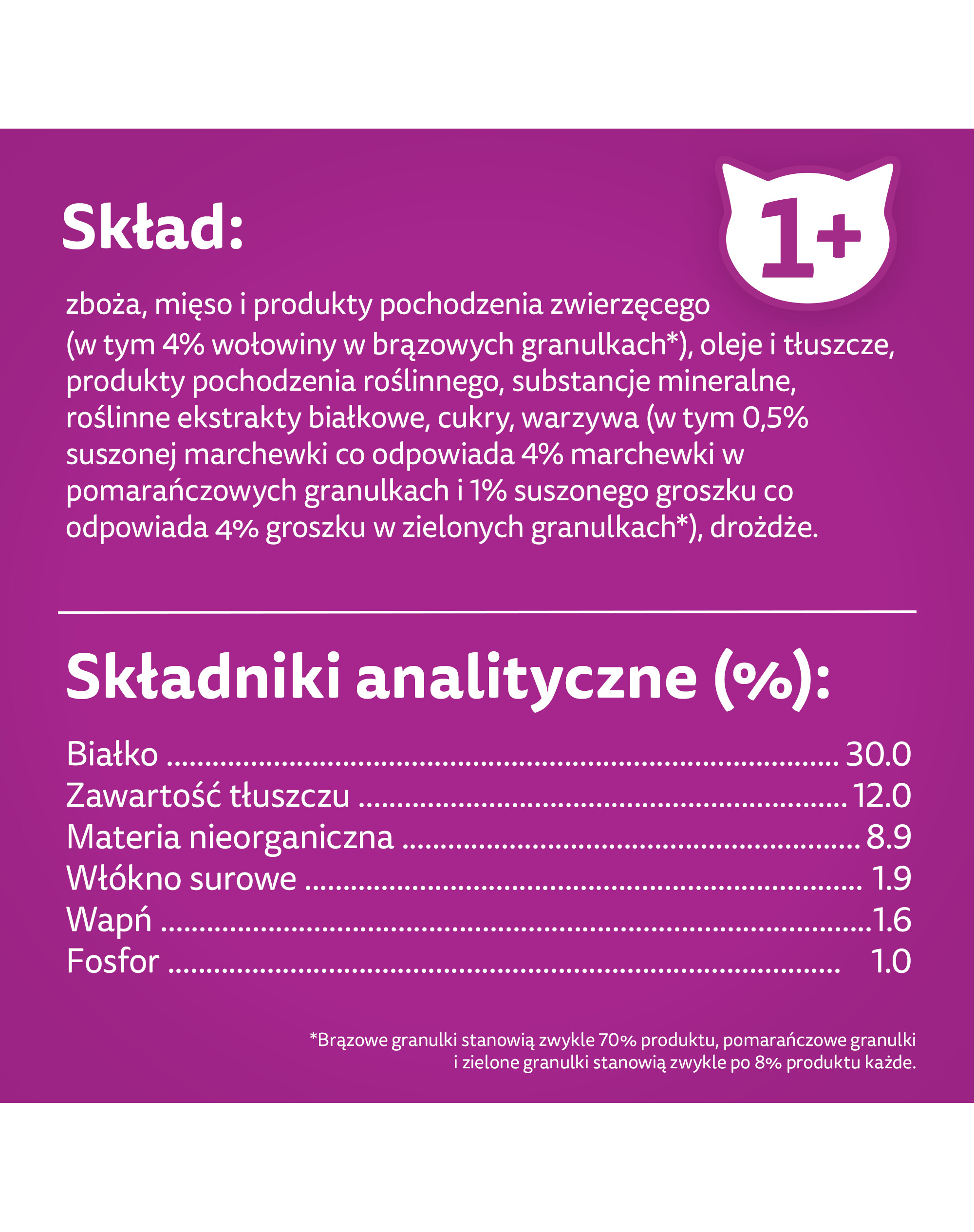 Složení: obiloviny, maso a živočišné produkty (včetně 4 % hovězího masa v hnědých granulích*), oleje a tuky, produkty rostlinného původu, minerální látky, rostlinné bílkovinné extrakty, cukry, zelenina (včetně 0,5 % sušené mrkve, což odpovídá 4 % mrkve v oranžových granulích, a 1 % sušeného hrachu, což odpovídá 4 % hrachu v zelených granulích*), kvasnice.