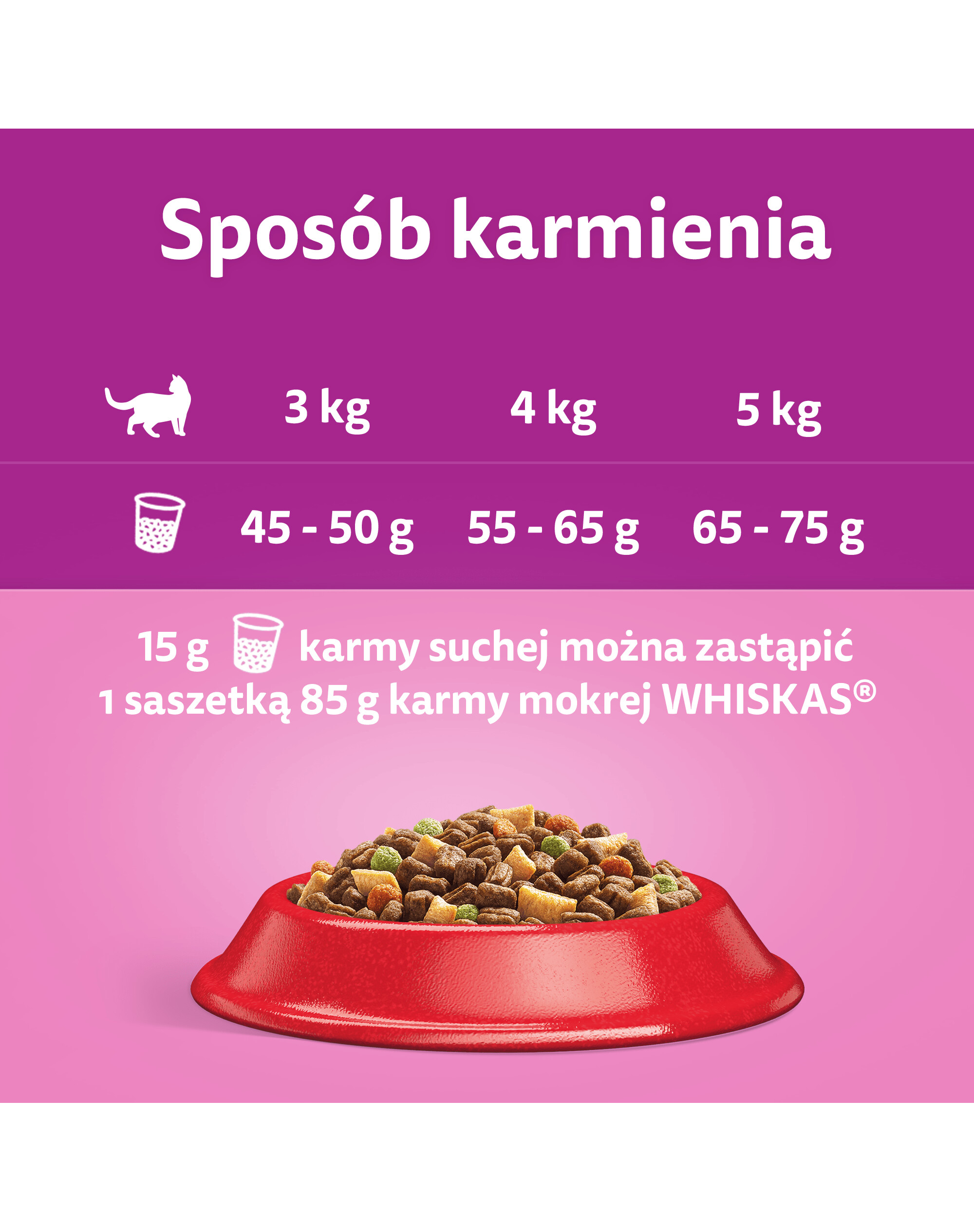 15 g suchého krmiva lze nahradit 1 sáčkem 85 g vlhkého krmiva WHISKAS.