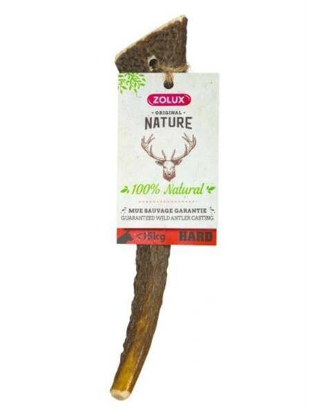 Celé jelenie paroží ZOLUX HARD je pre psov prirodzeným žuvacím prostriedkom. Parožie sa získava prirodzeným procesom zhadzovania paroží divokých jeleňov v Európe. Výrobok neobsahuje žiadne prísady, farbivá ani konzervačné látky, čo zaručuje vysokú kvalitu, ktorú ocení každý pes. Brúsené hrany paroží zaisťujú bezpečnosť pri žuvaní bez toho, aby poranili ňufák psa. Suchá kostná dreň je veľmi chutná, čo vášho psa povzbudí k tráveniu času a uspokojeniu jeho prirodzenej potreby žuť. Maškrta je vhodná pre psov s hmotnosťou do 15 kg.Rozmery